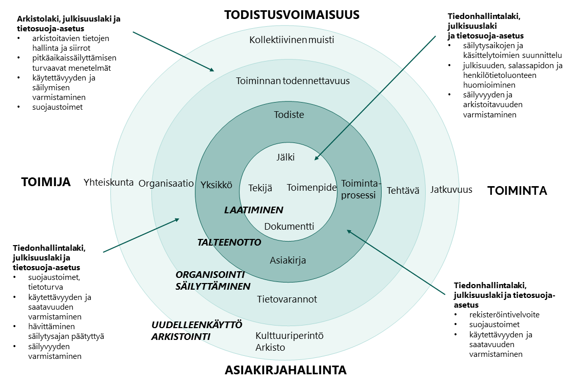 Jatkumomalli auttaa hahmottamaan myös tiedonhallintaan ja arkistointiin liittyviä vastuita. Oheisessa kuvassa elinkaarimalliin on sovitettu kansallisen lainsäädännön vaatimukset. Lainsäädännön vaatimukset koskevat muun muassa asioiden ja asiakirjojen rekisteröintiä, henkilötietojen käsittelyä, asiakirjojen julkisuuden ja salassapidon toteuttamista sekä säilyttämistä ja arkistointia.